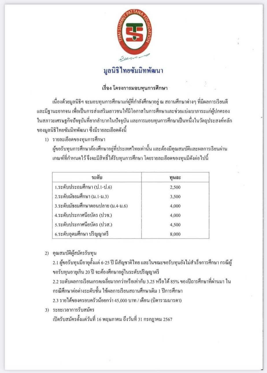 เนื่องด้วยมูลนิธิไทยซัมมิทพัฒนา เปิดรับสมัครเยาวชนที่ขัดสน โดยมอบทุนการศึกษาแก่ผู้ที่กำลังศึกษาอยู่ ณ สถานศึกษาต่าง ๆ ที่มีผลการเรียนดีและมีฐานะยากจน เพื่อเป็นการส่งเสริมเยาวชนให้มีโอกาสในการศึกษาและช่วยแบ่งเบาภาระแก่ผู้ปกครอง ในสภาวะเศรษฐกิจที่ยากลำบากในปัจจุบัน และการมอบทุบการศึกษาเป็นหนึ่งในวัตถุประสงค์หลักของการเปิดมูลนิธิไทยซัมมิทพัฒนานี้