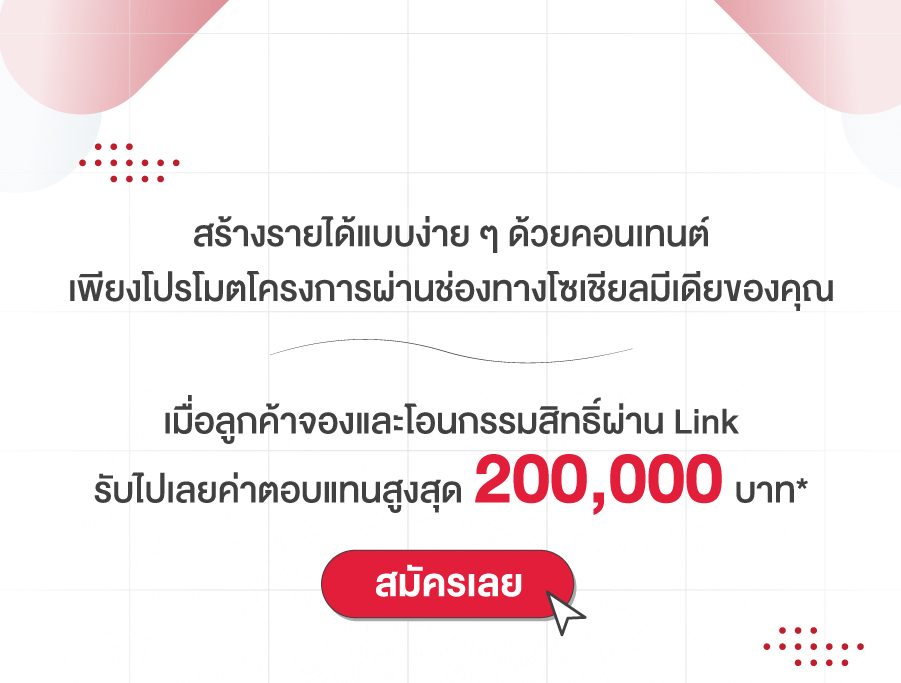 สร้างรายได้แบบง่าย ๆ ด้วยคอนเทนต์ เพียงโปรโมตโครงการผ่านช่องทางโซเชียลมีเดียของคุณ เมื่อลูกค้าจองและโอนกรรมสิทธิ์ผ่านลิงก์ รับไปเลยค่าตอบแทนสูงสุด 200,000 บาท*